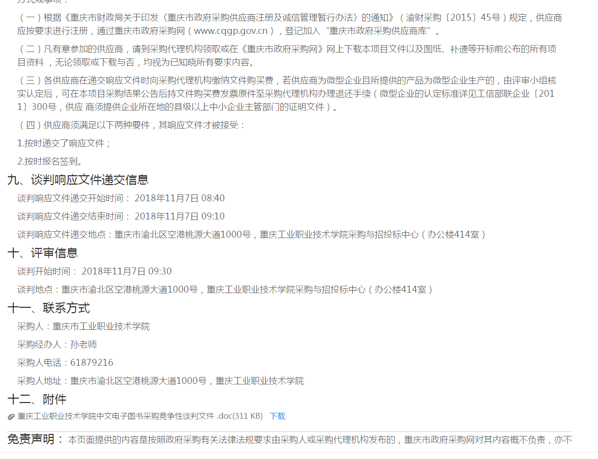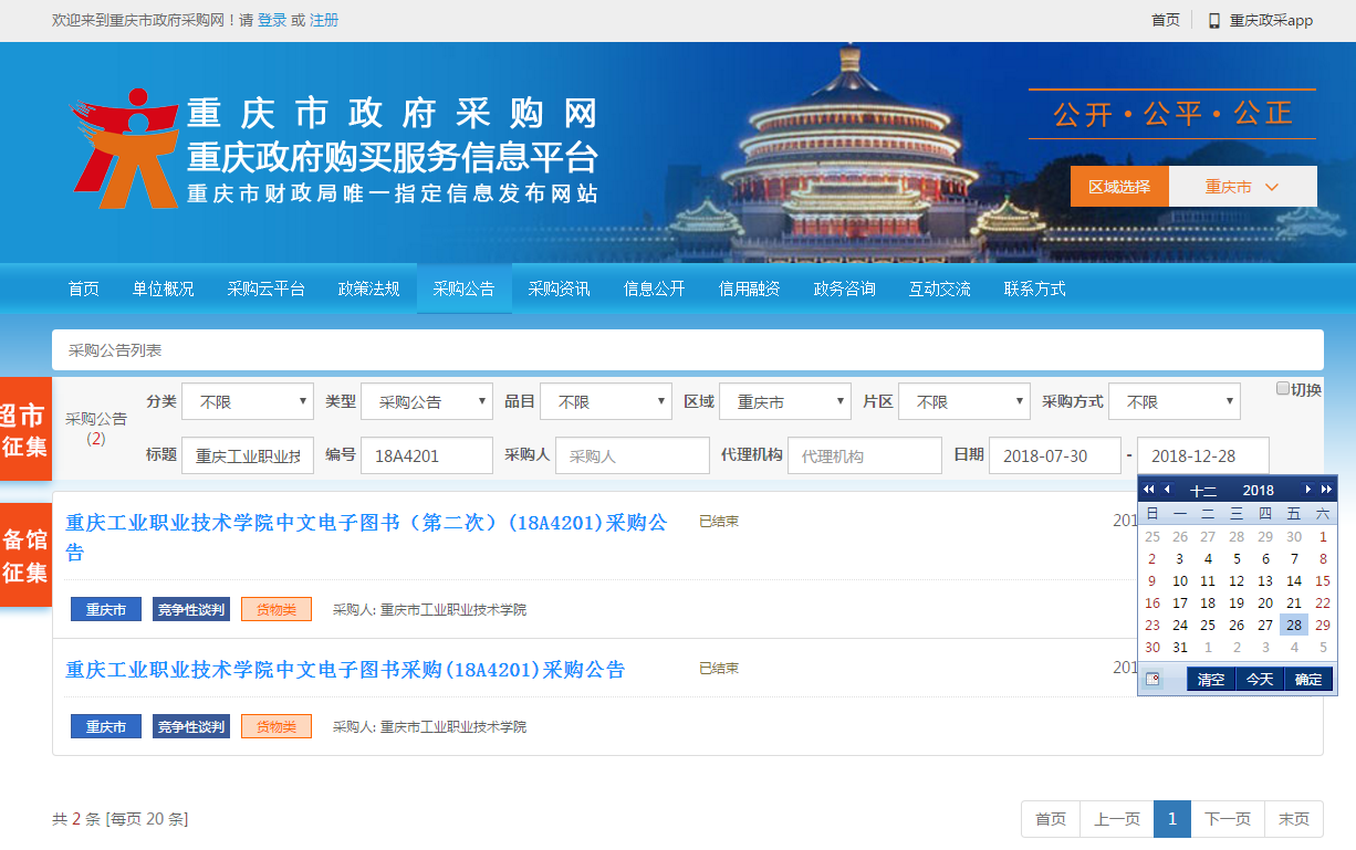 重庆工业职业技术学院消防器材设备服务特许经营权供应商代理资格(第五次)采购结果公示